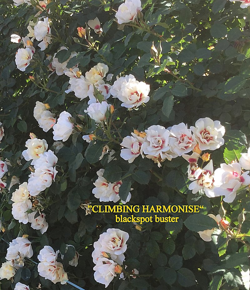 "CLIMBING HARMONISE"TM This rose is sublime! Heaps and heaps of flowers all season long in buff with a red centre. This rose is a Blackspot Buster with low or no blackspot nor mildew, so very well suited to all aprts of humid Australia. 4m x 3m. |