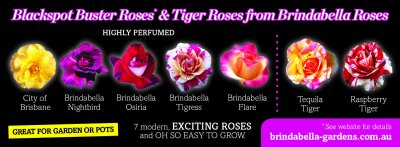 BLACKSPOT BUSTER ROSES tm STRONG PERFUME, LOW OR NO BLACKSPOT, NO MILDEW* 6 ROSES, 6 COLOURS, 6 STARS a new benchmark in roses for AUSTRALIAN GARDENS everywhere Here are 6 roses that are strongly perfumed and get low or no blackspot and no powdery mildew when you give them due care - and we know it works!* In a world first, we have bred out the 2 major diseases of roses and so you can plant the ultimate flowering garden roses with absolute confidence. No more ugly black spots all over the leaves that cause regular leaf drop. Just give them the care and attention you would your other valued garden plants and roses. BRINDABELLA BLACKSPOT BUSTER ROSES ARE SPECIALLY BRED SO THAT WHEN GROWING UNDER GOOD STANDARD CONDITIONS SUITABLE FOR ALL ROSES, THEY DON’T BADLY DEFOLIATE FROM BLACKSPOT LIKE OTHER ROSES DO. These excellent repeat flowering roses look good all through the growing season - a good cover of healthy foliage is retained throughout. AND their perfume is strong and divine - easily matching any of the best perfumed roses around . These are bushy plants that grow up to 1.2m tall and 1m wide, easily fitting into any garden. In pots they are around half this size and look great because they are always bushy with flowers coming in flushes every 6 weeks in large clusters. The flowers can be picked for the vase indoors and their perfume is just as a rose should be! Strong and sweet. |
