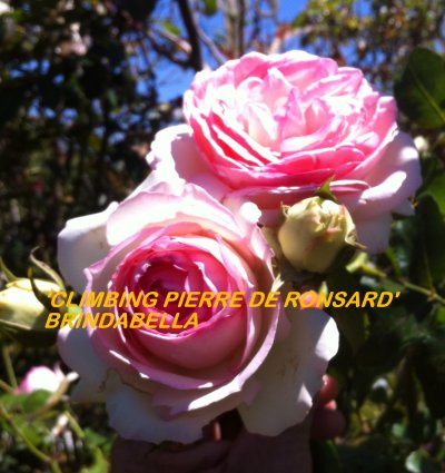 "CLIMBING PIERRE DE RONSARD" An ever popular climbing rose with flowers full of petals. Repeat flowers every 10 weeks or so and moderate growth to 6m.