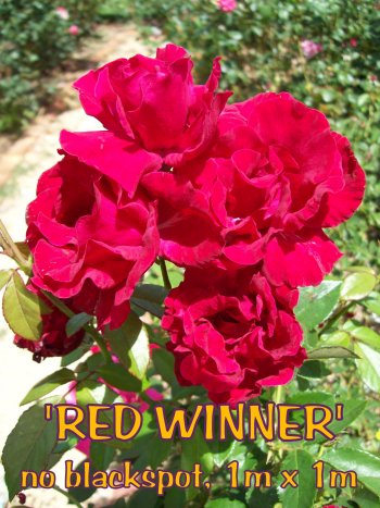 "RED WINNER "TMBLACKSPOT BUSTER ROSE. This floribunda rose is never without a flower, giving perpetual colour in the garden. The flowers are dark crimson red on a nicely shaped even bush. Light perfume and a very healthy rose with good foliage cover and the best red rose we've tested with low or no blackpost. HIGHLY RECOMMENDED.50cm x 50cm |